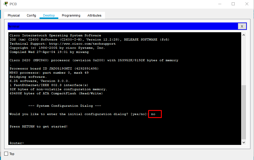 1. Kita buat topologi terlebih dahulu yaitu 1 PC dengan Router dan dihubungkan dengan kabel console. Biasakan untuk selalu mengganti hostname dan membuat banner